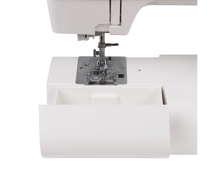 Швейная машина имеет горизонтальное челночное устройство и выполняет 18 строчек. В комплекте содержит 7 лапок, нитевдевающее устройство, а также жесткий чехол.