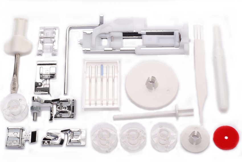 Имеет в комплекте 7 лапок, нитевдевающее устройство.